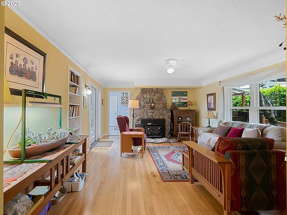 Enchanting SW bungalow w/cozy cabin vibe! Handsome living rm incl river rock frplc, hrdwds & built-ins; sunny vaulted dining w/skylights; remod entertainers kitchen; master w/full bath & updated guest bath; lrg private deck w/hot tub to enjoy the views/stars! Unfin basement=great storage! RARE 2 car garage w/charging station; 3 fenced yard areas w/lovely gardens & raised beds. New sewer, vinyl windows & H20 heater! Oil tank decomm & certified in July 2020! [Home Energy Score = 3. HES Report at https://rpt.greenbuildingregistry.com/hes/OR10184148]