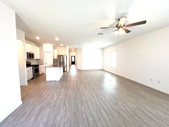 Wood privacy fenceHigh ceilingsLarge open floor planStainless steel appliancesCeiling fansQuartz countertopsCovered patio