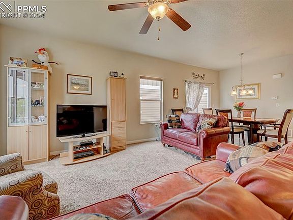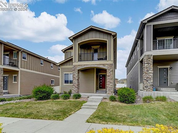 Well-appointed in the desirable Spring Creek neighborhood, this two-story home built in 2014 offers a functional floor plan with unobstructed views of Pikes Peak! The main level living room looks out to open space and flows nicely into the dining area that steps out to the fenced yard. The kitchen is complemented with beautiful granite countertops, a breakfast bar, stainless steel GE appliances (fridge with water/ice), and an abundance of cabinet space! The main level is rounded out with a half-bath, conveniently located off the rear attached garage, and a plus when having guests over! The second-story loft provides great flex space for work or play and is near the full bathroom that provides a dual vanity to accommodate the two additional bedrooms. Situated on the opposite end of the hallway, separated by the convenient upper-level laundry room, the massive primary suite walks out to a balcony with sweeping views of open space, the mountain range, and magnificent views of Pikes Peak! Complete with a walk-in closet and 4-piece bath, the owner's ensuite is the perfect retreat! Regardless of what window you look out, you will view open space, mountains, or pride of ownership from neighboring yards from a distance; a true benefit of this home's location is the surrounding open feel. The unfinished basement is plumbed for a bathroom and provides a clean slate should you wish to finish it. You'll reap the benefits of the paid off solar array that is just 4 years old with low electric bills year-round! Central air conditioning with whole house humidifier was added in 2015, a perk for those sizzlin' summer days! The fenced yard provides privacy (with a view) and a combo of plants, rock, and grass with a sprinkler system. A community park with a playground is located a short stroll away and there is a community center available for meetings or social gatherings. New sump pump & garbage disposal. Only one owner, YOU should be the second! Your Search is Over, Welcome Home!