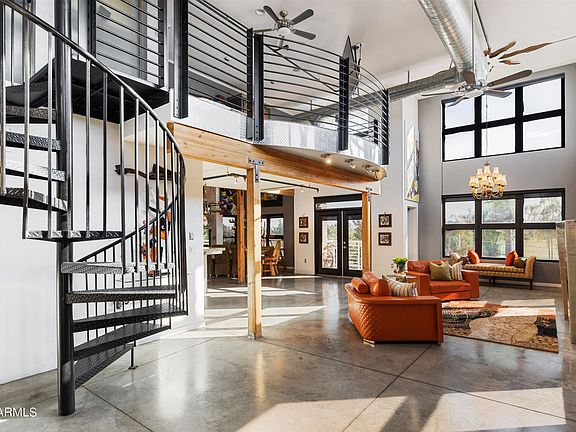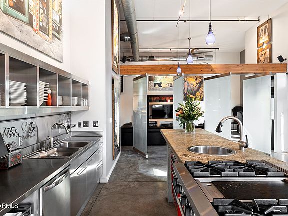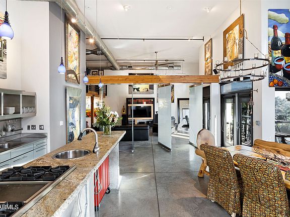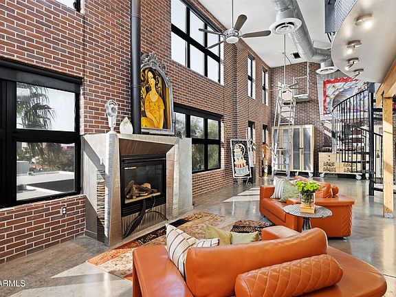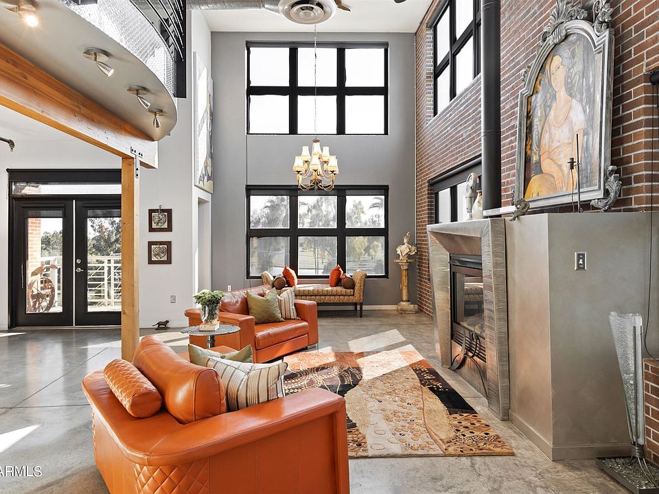 Welcome to an exquisite luxury penthouse nestled in the prestigious community of Artisan Lofts Condominium. Walk through the grand entry to 18+ high ceilings with exposed ducts, concrete floors & custom low voltage lighting. The South orientation with French doors opening to the terrace showcasing spectacular panoramic views of Phoenix Country Club golf course & the skyline. The spacious living room with accent brick wall and fireplace. Pivoting, sandblasted glass panels allows for family room to be separated from, or open, to formal dining room & kitchen. The Chef's Kitchen features Sub-Zero, Wolf, custom cabinetry and 21/2 inch granite counter. 2 master suites with separate entrances. 4 garage spaces. 360 degree roof top deck.