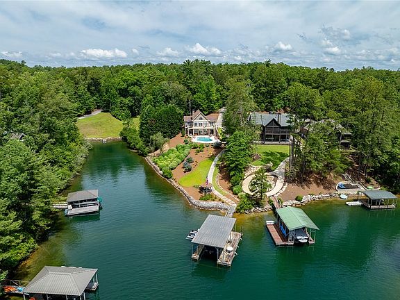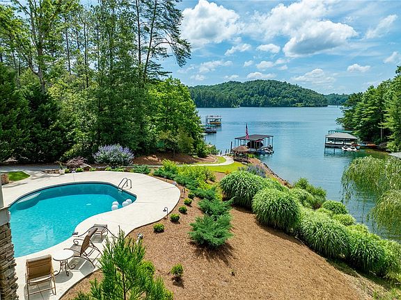 Nestled within the prestigious Keowee Bay subdivision, this exquisite 4-bedroom, 4-bath retreat offers unparalleled luxury with in-ground salt-water pool, and breathtaking views of North Lake Keowee. From its elegant down to earth interiors to its expansive outdoor living spaces, every detail of this home is designed for comfort, relaxation, and entertainment. Step into an inviting open concept living area adorned with rich wood floors and soaring vaulted ceilings. The gourmet kitchen boasts granite countertops, generous cabinet storage, and top-of-the-line appliances, ideal for culinary enthusiasts and gatherings alike. The adjacent dining area accommodates large family-style meals while overlooking the tranquil lake waters. On the main level, two spacious bedrooms offer serene lake views and each feature ensuite baths adorned with luxurious finishes, including granite countertops and walk-in tile showers. Privacy and comfort blend seamlessly in these well-appointed retreats. Descend to the lower level where additional living space awaits, perfect for recreation or quiet relaxation. Two more bedrooms, each with ensuite baths, provide ample accommodations for guests or family members. A cozy living area with a floor-to-ceiling stone fireplace creates an inviting ambiance for gatherings or peaceful evenings by the fire. Outside, discover an outdoor paradise designed to enhance lakeside living. A sprawling deck on the main level is ideal for entertaining, offering panoramic views of the lake and surrounding landscape. The lower-level patio features a hanging daybed swing and ample seating, overlooking the in-ground saltwater pool where days can be spent basking in the sun or enjoying a refreshing swim with unobstructed bay views. A private covered dock awaits just steps away, equipped with a boat lift, 2 jet ski ports, and convenient kayak storage. Whether you're lounging in the lakeside gazebo or taking a stroll along the beautifully landscaped path illuminated by soft landscape lighting, every aspect of this waterfront retreat is crafted to maximize enjoyment of the lakefront lifestyle. A concrete driveway leads to a single-car garage with added storage space, ensuring convenience and practicality. A cart path from the driveway provides easy access to the lakeshore, where adventures on the water await. Located within a peaceful cove, this home offers protection from boat traffic while still providing expansive bay views, creating an ideal environment for swimming, fishing, and enjoying the natural beauty of North Lake Keowee. This property combines the allure of a serene lakeside setting with luxurious living spaces and comprehensive outdoor amenities, making it ideal for both relaxation and entertainment on North Lake Keowee. The home’s water is supplied by community well.