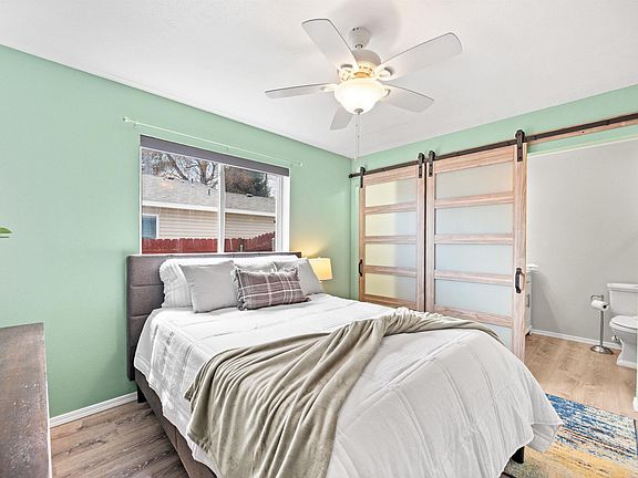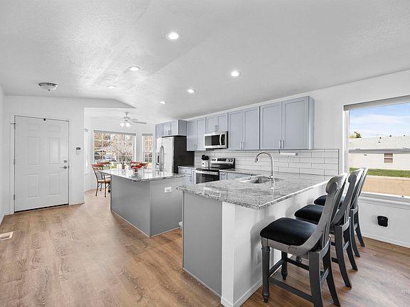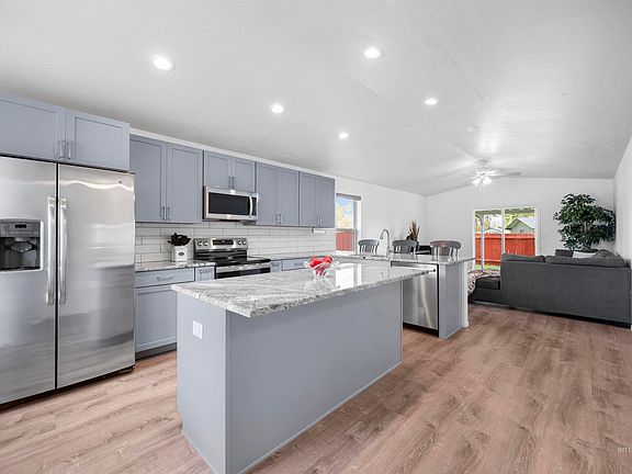 Offering a perfect blend of modern updates and comfortable living, this home has a bright and open floor plan that creates a welcoming atmosphere ideal for both relaxation and entertaining. The beautifully renovated kitchen, completed in 2022, boasts gorgeous slab granite countertops, offering both style & functionality. New LVP flooring throughout the home adds a sleek, low-maintenance touch. The primary bath and walk-in closet were thoughtfully remodeled in 2024 providing a luxurious retreat with ample space. Outside, you'll find a sizable backyard complete with a covered patio, perfect for outdoor gatherings & a handy storage shed for added convenience. The fully fenced yard, along with the automatic sprinklers, ensures that the space stays lush & well-maintained. Located just 0.2 miles from the Nampa Greenbelt walking path and just a 5-minute drive to quaint downtown Nampa with great restaurants and shopping. Chicken friendly with no HOA, don’t miss the opportunity to call this charming property yours!