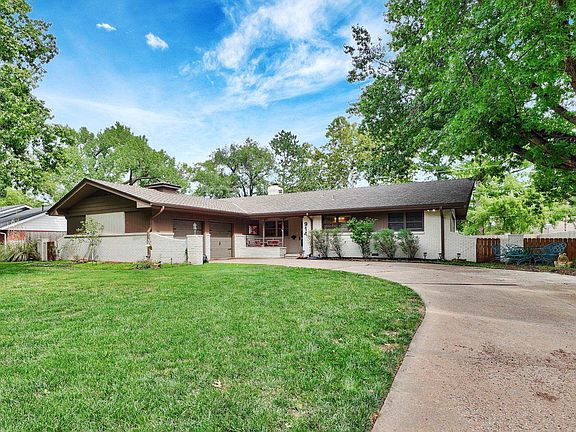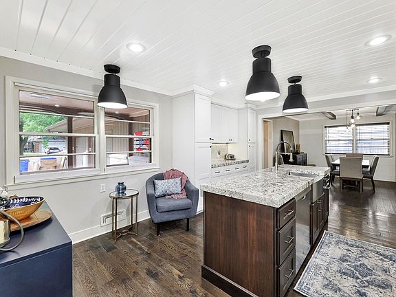 This fantastic mid-century modern home sits on the tree-lined streets of Woodlawn Village. The remodeled and modern kitchen is a chef's dream featuring double wrapped granite counter tops and Carrara marble backsplash. The eight-foot island and adjacent serving counter provide plenty of space to prepare and serve guests. The tongue and groove ceiling and lovely wood floors make this kitchen a complete showstopper where function meets form. The two generous living spaces share a see-through fireplace. The living room is an amazing 360 square feet with large windows for a bright and sunny feel and the adjacent hearth room is large enough for a dining table and sitting area and the perfect place to cozy up for a tv night. Step out the patio doors and find the paver patio with ledges for extra seating, built in planters, and an outdoor fireplace for peaceful morning coffee or fun evenings with family and friends. The fully fenced yard is big enough for yard games or a round of touch football. At the end of the day you will rest well in the ample primary suite featuring a large closet with built-in shoe storage and an en-suite. The remodeled laundry room has a storage closet and sink. You will be amazed at the oversized two car garage with built in shelving and two storage closets. The roof was replaced with 50-year shingles and new gutters were installed in 2019. The Heating and air were just installed and it's chilly inside! The sellers removed carpeting and installed new carpet in the living room, wood floors in the family room, and exposed the original oak floors in the bedrooms.