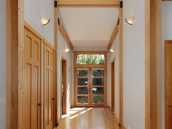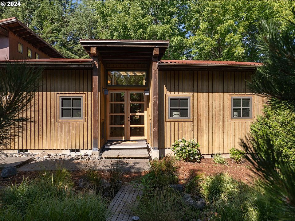 Welcome to a signature residence in the sought-after Willow Ponds community of Hood River! This custom-crafted masterpiece by renowned local builder Mike Butterfield stands out from the start with its stunning blend of cedar and custom metal exterior detailing. The entry greets you with exquisite oak hardwood floors inlaid with African wenge, and the vaulted ceilings are highlighted by impressive beams and an artistic skylight that fills the space with natural light. Floor-to-ceiling tower windows offer picturesque views of the beautifully terraced grounds. The open kitchen features a large granite island with a second sink and bar seating, ideal for both cooking and entertaining. Relax in the living room, complete with an iron-front gas fireplace, or step through double French doors to the back patio for outdoor enjoyment. The extra-wide hallways and doors ensure ease of movement throughout. The spacious primary bedroom includes an en suite bathroom with a walk-in shower, heated tile floors, and a convenient laundry area. The secondary bedroom provides privacy with direct access to a full bath. Above the detached garage, the third bedroom and full bathroom offer a versatile space for guests, an office, or a studio, complete with a charming deck. This home is truly special, situated in one of the most desirable locations! Be sure to stroll around the development and check out the shared spaces such as community garden, picnic spots, play areas, ponds, bridges and paths!