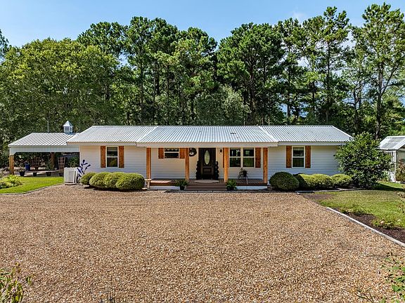Welcome to your own slice of paradise! Nestled on nearly 6 acres of towering oaks and mature trees of many types shading a winding creek and a new duck pond for the 5 native ducks, this 2258 sqft, 3 bedroom, and 3 bathroom home offers open concept living where the inside and out flow seamlessly together. Two of the bedrooms have ensuite bathrooms including a stained glass window in the tiled primary shower. This home has updated features throughout including all new shiplap in the living room, floor to ceiling french windows in the bedroom, and much more! Step outside where the living space flows directly through a deep back porch onto an expansive concrete cool deck entertaining area surrounding the pool, firepit and leading directly into the outdoor kitchen complete with bar, barstools, and cedar accent wall. Watch the big game, play darts, host the family reunion! Room for everything! There is a large open field across from the antique barn that can park many cars. It's a Must See!!