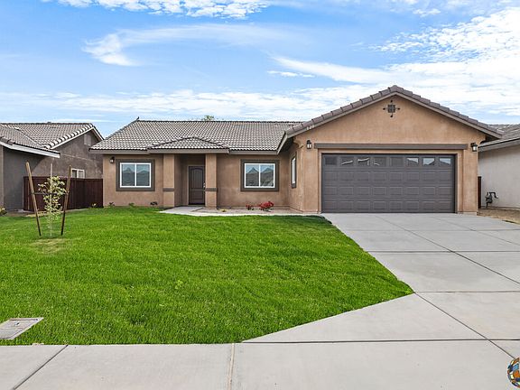 This brand new, single story home in Brawley is sure to impress. This great room opens to the dining and kitchen with a powder room for guests. Shaker cabinets and quartz countertops provide an elegant, modern look. Stainless steel appliances include a stove, microwave, and dishwasher. The primary bedroom has a large walk-in closet and en suite bath with dual modern sinks and hardware throughout the house. Updated floorings include ceramic tile, designer carpet, and custom tile floors. The front yard is landscaped with grass and drought-tolerant plants that are watered by an automatic drip system. Furthermore, this home offers extended energy savings compared to homes of similar age due to its new construction status. It is within short distance of shopping, dining, entertainment, Pioneer Medical Center, and schools which makes it ideal for anyone who loves convenience! Interior photos are of model homes; this one will be ready for closing within 30 Days!