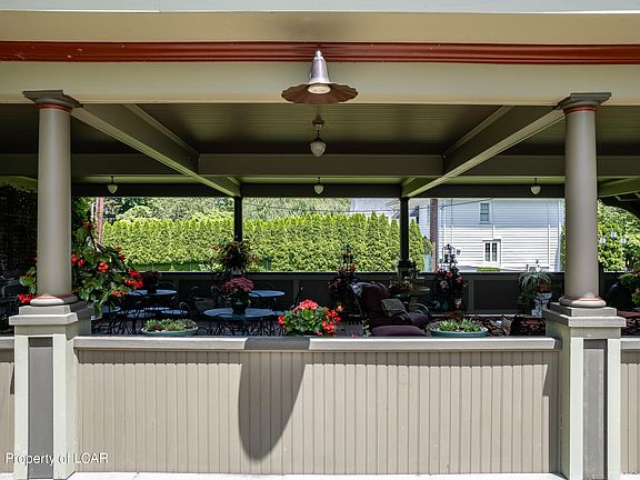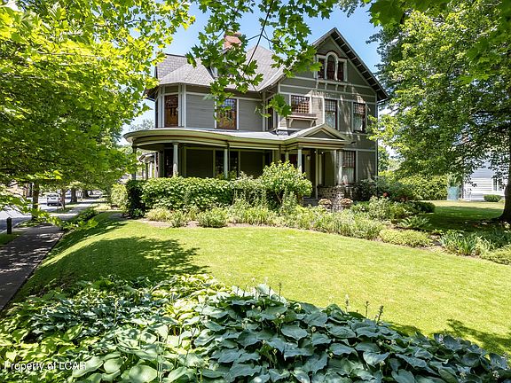 Buy a piece of History along the Oldest River in the World!! Susquehanna Avenue in West Pittston is well known for its magnificent & stately homes. The full architectural style Victorian Stick with Queen Anne influences restoration of the George B. Thompson home to its original beauty of 1891 is an example of the opulent splendor of a time past, offering a striking view of the Historic Susquehanna River spread over 1.17 acres & 5700 sq. ft. of living space. Sitting back from the tree-lined avenue, it offers a striking view of the Susquehanna River. The Thompson home's architectural style is Victorian Stick with Queen Anne influences. The Stick style is a transitional style. It preceded Gothic Revival and was rapidly replaced by the Queen Anne style. The identifying Stick style features of the Thompson home are the gabled roof, decorative trusses, overhanging eaves with exposed rafter ends and wooden wall cladding with horizontal boards for emphasis. The home was built to maximize the river view, complete with large windows and an oversized front veranda. plaster walls were repaired, not dry walled over. All hardware, from hinges to doorknobs was brass. It was carefully removed and sent out for polishing. It was decided to keep the original wavy glass windows. Thus the aluminum storm windows were thrown away and rotted sashes replaced. Every window was taken out and delicately rehung to work properly. Oak hardwood floors with walnut trim were installed on the first and second floors. Honoring G.B.'s progressive attitude, central air conditioning was added along with moving the laundry room to the second floor. The exterior rotting siding was replaced and painted shades of mossy green. The front veranda's scope of work proved to be a larger project than first anticipated. Much care was spent in rebuilding the curves of the original roofline. The dilapidated floor tiles were removed and replaced with tile the same shape and color. Aluminum gutters were replaced with copper. Sandra spent much time researching period appropriate decorating styles. Many of the walls and ceilings are covered with papers from Bradbury & Bradbury; well known for their hand silk-screened historically designed wallpapers. John spent much time pouring concrete. New sidewalks were installed as well as granite curbing. The crumbling front hitching post was re-built. John's greatest accomplishment was the three-car garage attached to the back of the house. The stone on the garage façade was carefully matched to the home's foundation stone. Designed and built by John, the garage rooftop boasts a patio, complete with a pergola, climbing wisteria and a garden. Perhaps the best-known feature of the restorations is the springtime landscaping. Sandra's favorite flower is the tulip and over a thousand bulbs have been planted in the gardens.