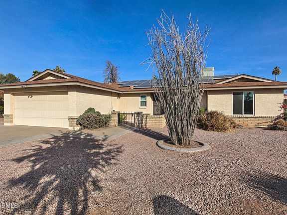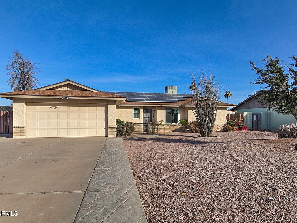 This Chandler charmer has a large, low maintenance front yard with an extended driveway and RV gate. Inside, there is wood laminate and crown molding that runs throughout the three bedroom, two bathroom home. The main living area is open and has lots of natural light and vaulted ceilings. The kitchen has white cabinets and stainless steel appliances. The owner's suite has a large window that looks out to the backyard and dual sinks in the en-suite bathroom. The two secondary bedrooms share a nicely updated bathroom. The laundry room has extra cabinets for storage and space for a second refrigerator. The backyard is nicely landscaped with turf.