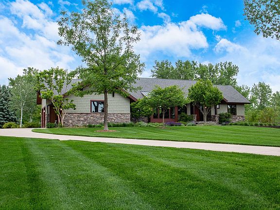 Extraordinary Arts & Crafts style walkout ranch home with 5 bedrooms, 3 bathrooms & 3 car garage has timeless design choices & is meticulously maintained.  Rare opportunity for custom home of the highest quality. Acclaimed SALA architects in Minneapolis designed this home with an efficient yet spacious open floor plan. Abundant natural daylight and large windows throughout the home, 9’ min ceiling height. Exterior details include stone on all sides of the home & large Ipe wood deck. Copper shed roofs extend walls of windows to take advantage of expansive views north to a mature forest and south to ponds. The front porch welcomes you with its oversized quarter sawn white oak door & blue flagstone which continues into the foyer. Main floor features wide plank American black walnut floors in living spaces and all bedrooms. Living room enjoys reclaimed Douglas fir ceiling beams & mantle, built in copper leafed displays and a stunning stacked stone FP. Beautiful and functional chef’s kitchen with alder & maple cabinets, granite & sycamore counters, granite sink & SS appliances. Laundry room features stained concrete floor, cabinets, dbl closet & sink. Relax in the master bedroom suite with tin accent ceiling, french doors to deck, custom alder closet & 2 way FP to the bathroom with soaking tub, travertine shower, marble counter & daylight mirrors. 2 more bedrooms on the main each have dbl closets & big windows. Full travertine & marble bathroom for these BR's and guests. All closets have custom shelving & built-ins. Zoned speaker system indoors & out. The walkout lower level has family room with surround sound, stained concrete floor, brick walls & 2 way FP. Glass doors take you to an expansive alder library with WIC (could be BR or office). Off the family room is a wet bar with large walk-in wine cellar (could have other uses). There is one more BR with stained concrete floor & large WIC. Finally a ¾ bath with marble counter & alder cabinets. Open enroll Dakota Valley.