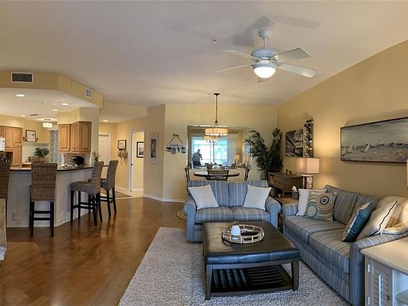 Updated 3 bed/2 bath 2nd floor "Bradford" overlooking the lake, tiki bar and fountain! Complete kitchen remodeled with maple cabinets, quartz countertops, newer appliances and tumbled marble backsplashes! Master bath features granite tops, newer vanity, tiled shower and backsplash! Guest bath has granite top, newer vanity, newer faucets and light fixtures! Maple hardwood and 18" tile flooring throughout! Also features plantation shutters, decorative bead boarding, newer ceiling fans, and custom cornice boards! Enclosed tiled lanai has glass sliders with custom made roll down sunshades! 2009 Trane variable speed 16 seer A/C, extra large storage and selling furnished minus exclusions! Pay as you Play Golf!