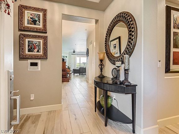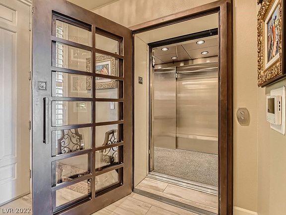 Single-level, highly upgraded condo located behind the gates of Mira Villa in Summerlin. Bldg is constructed of steel and cement for optimum sound abatement. From the elevator welcome guests to your home featuring an open concept area w/great room, kitchen, dining area, tiled wrap around balcony...all with magnificent views of TPC Golf Course, Red Rock Canyon and the northwest valley. 60" Neptune elec FP and b/i entertainment unit w/surround sound throughout. Bosch SS appls, soft close cabinets, pull out shelves, granite countertop, osmosis system, and instant hot water dispenser. Primary bedroom features walk-in custom closet and walk-in shower w/temp control, sprays and handheld. Den w/French doors, built in bookcases and Juliet balcony. Guest bed w/walk-in closet, bath w/walk-in shower. Private garage w/Liftmaster MyQ garage door opener and storage. Community amenities include clubhouse, pools, spas, BBQs and gym. Located near shopping, restaurants, golf courses, and Summerlin Pkwy.