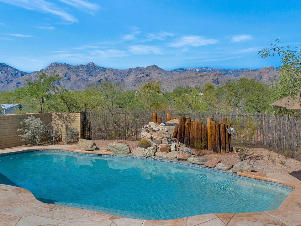 Experience unparalleled mountain views and exquisite modern upgrades in this stunningly renovated 3-bedroom, 3-bathroom residence, offering 2,248 sq ft of elegant living space on just under an acre. Move-in ready, this home features a gourmet chef's kitchen with a spacious eat-in island, brand-new windows that flood the space with natural light, and updated flooring throughout. The expanded primary suite, thoughtfully designed by combining two bedrooms, serves as a serene retreat with a generous closet and ensuite bathroom access. The open floor plan seamlessly integrates a contemporary great room, perfect for entertaining or unwinding while taking in the breathtaking mountain scenery. A large indoor utility/storage room, complete with a sink, provides ample storage and (continued) practicality, while updated bathrooms and a convenient outdoor pool bath add to the home's modern appeal. Step outside to your private paradise, where a fully renovated pool with new plaster, tile, and equipment awaitsideal for soaking in the serene surroundings. A two-car garage provides plenty of space for parking and storage. With high-end finishes and luxurious touches throughout, this property is a haven of comfort and style amidst a stunning natural backdrop. Don't miss your chance to call this exceptional home yours!