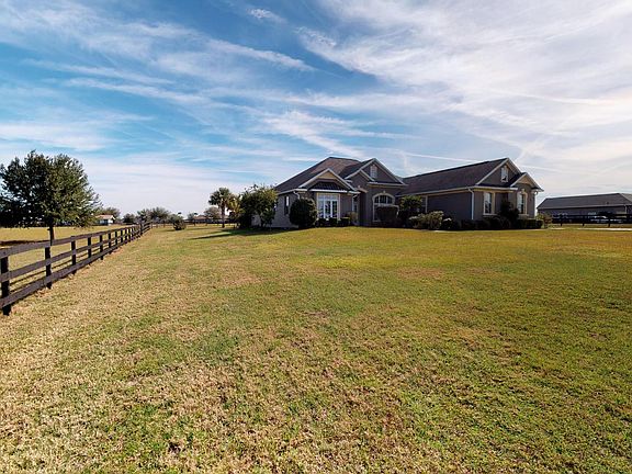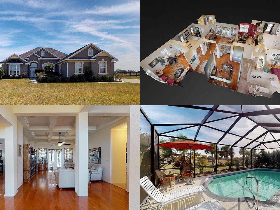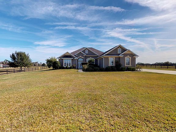 This exclusive single level family home sits on almost a four acre plot in the heart of beautiful Ocala. Originally built by Triple Crown, this home is being offered for sale for the first time! Gorgeous screened pool with a private lanai. Gated Bradford Farms is a highly sought area of mini farms. Property is completely fenced for extra security for the family. Four bedrooms and three bathroom home has many great features like beautiful views, spacious and open floor plan, beautiful wood floors, three car garage and incredible coffered ceilings. Upon entry you are greeted with high ceilings and the natural stunning views from the many windows. The family room is spacious with large windows and French doors with views of the pool area. The kitchen extends off the family room and