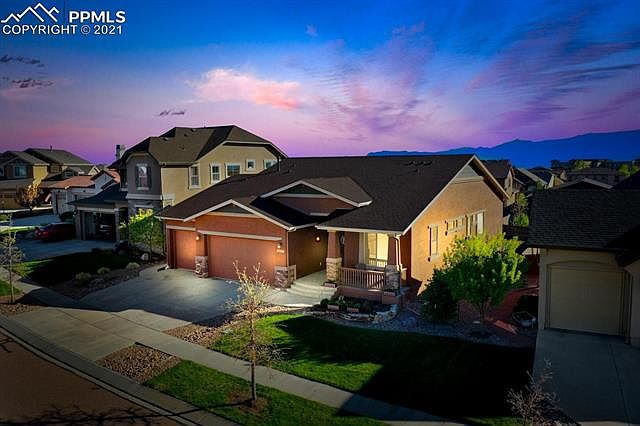 Wonderful Saddletree ranch home located at 9142 Lookout Mountain Court! Situated on a large lot, this 6 bedroom/4/3 home has plenty of room for everyone. Huge gourmet kitchen with double ovens, pot filler and gas stovetop. Upgraded 42 inch cabinets too! Large island with an open feel into the family room to keep company while entertaining. Colorado like-stone fireplace in family room helps to make the area feel warm and cozy. Upstairs you will find three bedrooms and three bedrooms in basement. Junior suite with personal bathroom for guests or in-law off living area. Outside enjoy incredible Pikes Peak views under a large covered composite deck. Below is one of the larger Cordera lots with a cement slab for more entertaining, hot tub or fire pit. This garden level basement is an entertainer's dream. The roomy media area includes the screen and projector. Surround sound downstairs and tray lighting helps to feel like you are in a real movie theatre. Completing the basement are three HUGE bedrooms, a jack and jill bathroom and tons of storage. Cordera is a wonderful community with an amazing recreation center, parks and trails. Close to schools, shopping, military bases and the Powers Corridor. Lookout Mountain Court is a beautiful street. Come see this special gem!