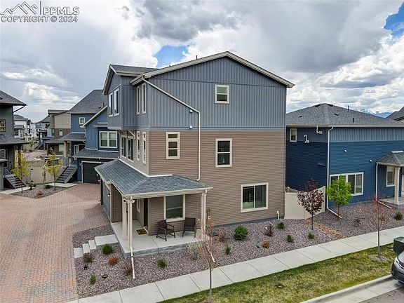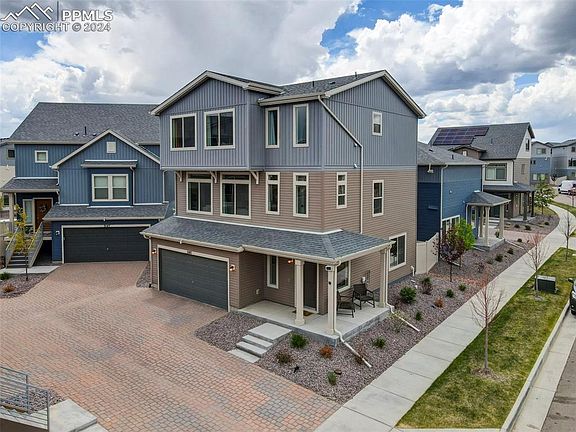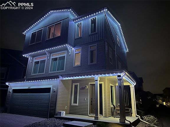 This home and its modern architecture is strikingly beautiful. Walking through the front door into the spacious front entry you are met with beautiful hardwood floors and an instant feel of home with the cozy and quiet family room tucked away from the rest of the home. A sliding glass door provides walk out access to the backyard. The upper level has an expansive living area that flows into the kitchen which is perfect for entertaining. The kitchen boasts ample cabinet space, large center barstool height island, GE Cafe Kitchen Appliances including a gas stove that make the kitchen pristine. Just off the dining area a sliding glass door opens to the back deck welcoming the outdoors in for the wonderful Colorado summers. The upper level also has a private office off the kitchen for the perfect work from home space. The uppermost level hosts three bedrooms, and two baths including the master bedroom and ensuite bath with beautiful fixtures. The home is also equipped with permanent holiday lighting by Rocky Mountain Trimlight. No detail is left untouched in this stunning home. The Banning Lewis Ranch community has amenities galore, including neighborhood schools, over 75 acres of parks/trails/open space, tennis courts, basketball court, rock climbing parks, zip-lines, access to pools, splash pad, water park, and dog park. Recreation center houses a fitness center and also regularly hosts classes and events for all ages. In the summer months, catch a neighborhood concert, festival, food trucks, farmers market or enjoy other regular community events.