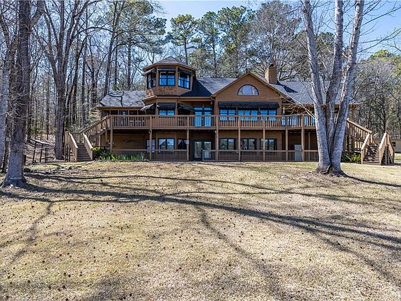 Nestled on a tranquil deep-water cove on Lake Harding, this custom-built lodge-style home exudes warmth and rustic charm. The great room showcases soaring tongue-and-groove wood ceilings, a stacked-stone wood-burning fireplace, and floor-to-ceiling windows that capture breathtaking lake views. Rich heart pine walls, ceilings, and floors. The kitchen is a dream, granite countertops, stainless steel appliances, and water views. The spacious master suite, complete with an ensuite bath, his-and-hers closets, and French doors opening onto a deck. The main level includes two guest bedrooms and a full bath, the upper level offers a bedroom and bonus room. Private retreat is set on a secluded 2.61-acre lot. Lower level living space, including recreation room with a fireplace, bonus room or extra bedroom, a full bath, and an office. Additional highlights include an oversized 700 sq. ft. two-car garage, a 21’ x 30’ boathouse, floating dock, stationary dock, and 350 feet of stunning waterfront.