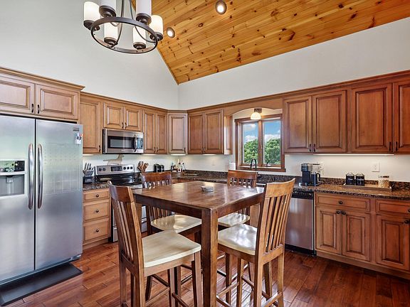 - Storage, Open Floorplan, Eat-in Kitchen, Double Vanity, Chandelier, Beamed Ceilings, Cathedral Ceiling(s), Ceiling Fan(s), High Ceilings, Natural Woodwork, Recessed Lighting, Vaulted Ceiling(s)