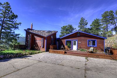 Panoramic views of pine-covered Shadow Mountain, Flying J open space, and snow-capped Mount Evans! This private oasis is still perfectly accessible to everything you love: 5 mins to shopping, restaurants and high-rated schools in Conifer Aspen Park area; 15 mins to dining, shops and entertainment in Evergreen; 35 mins from downtown Denver. County-maintained road supports your morning commute all year round. Main house is a nearly-stairless ranch with unique and artistic touches, exposed wood, vaulted ceilings, tons of natural light, and skylights galore. Authentic moss-stone fireplace in the living room, and wood burning stove in adjoining sitting room, for ambiance and additional heat. Hot water baseboard heating offers deep, consistent heat without drying your home. 3 bedrooms in the main house, 2 of which have adjoining bathrooms: one with large soaking bathtub, one with large walk-in shower that has a picture window with private mountain views. Huge deck with breathtaking views, and shaded patio near the hot tub, providing amazing opportunities for mountain entertaining. There's more! Recently renovated detached studio provides 870 sqft of additional living space for you and your guests, including amazing custom woodwork, large great room, gas fireplace, kitchenette, and a master suite with more private views and an ensuite bathroom. Major 2021 updates include: upgraded metal & composite roofing with new gutters and solar panels; remodeled studio guest house; new dog run and covered dog kennel; new flagstone patio and pathways; upgraded main electrical panels; and new 8-foot hot tub on a custom platform with private mountain views. *Legal horse property with multiple flat areas* Home and detached studio have unique history involving the band Chicago and Robert Redford. Flying J Open Space is a walk or bike ride away.