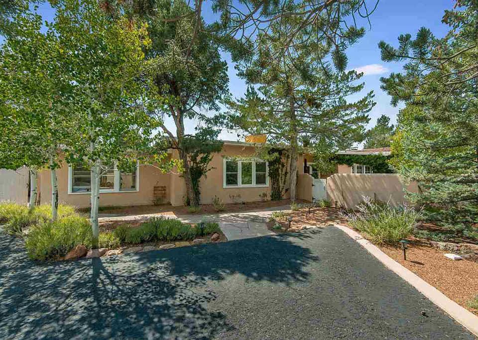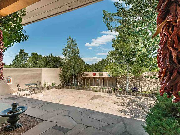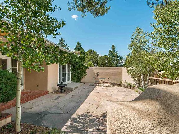 Gracious north side home located just minutes to the Santa Fe plaza across from Mansion Ridge Rd. This home has been updated, and thoughtfully cared for. It offers a great in town location, beautiful front courtyard with watering system for flowering plants, large enclosed rear flagstone patio, 3 bedrooms with attached updated bathrooms and detached double car garage. Both patios surround the main living areas and are perfect for outdoor entertaining. The living room and den include hardwood flooring, fireplaces, beamed ceilings with French and sliding glass doors. The gorgeous kitchen has granite counter tops, maple cabinetry, built-in pantry and gas cook top. This one acre lot is tree covered, fenced and beautifully landscaped along the entrance to the home where deer can be seen strolling among the Pinon trees.