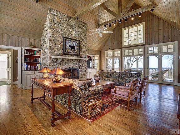 This is the first time this home located in Old Brushy Face has been on the market. There is a 2-car porte cochere in the front which allows easy access to the main floor which has a bright living room with a soaring cathedral ceiling, stone fireplace and french doors opening to a screened porch that offers spectacular Blue Valley views. The kitchen, living and dining rooms are an open plan with paneled walls and beautiful hardwood floors and finishes. Just off the living room is an office/library and full bath. One master suite is located on the main floor with 2 baths, walk-in closets and a private balcony. The large laundry room finishes off the main floor. There are no steps into this floor which makes it handicap accessible. Upstairs there is a second master suite with 2 baths, closets and balcony. In addition, there are 2 additional bedroom suites on the second floor. The lower floor offers a den with a second stone fireplace, screened porch, a bonus room that is used as a bunk room and a full bath. There is also a 2 car garage and ample storage on the lower level. The yard offers garden areas and a play set for children. Brushy Face is an established neighborhood of around 20 homes within the town limits and offers town utilities. Brushy Face is also adjacent to the Brushy Face Preserve and trail that is part of the Highlands Cashiers Land Trust. With 2 master suites, this would be a great home for 2 families to share.