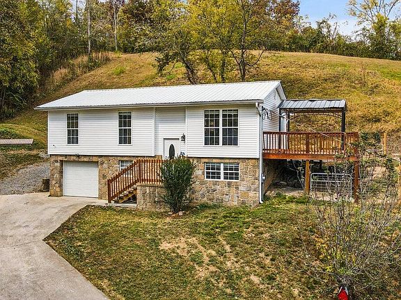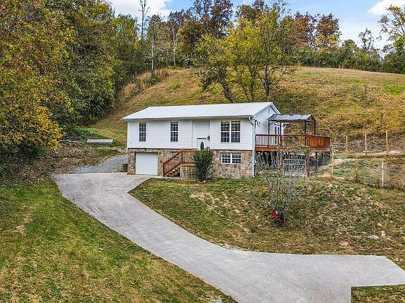 Awesome split level farmhouse with metal roof situated on 5.4 Acres of privacy and seclusion featuring a huge 24x35 detached workshop garage. The 3 Bedroom, 2 Bath home features an open and flowing floor plan with luxury vinyl plank flooring throughout the home. The spacious kitchen flows into the living room and offers a full compliment of kitchen appliances and a mobile kitchen island with storage. Exposed beams add character and architectural interest. The primary bedroom offers a walk-in closet and an ensuite with a huge stand up shower. A basement rec room would make a fantastic theater room or game room. The Heat and A/C unit is only 2 years old and the washer and dryer is included with the house. Loads of storage in the 1-car attached garage, the detached metal building and also in the mobile home at the top of the property. It has power but has been used as additional storage but could make a great workshop or possible additional housing with some updates. Country living only minutes to downtown Knoxville or downtown Sevierville.