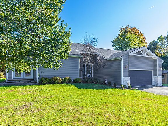 Looking for something a little different a couple acres? Look no further... this awesome ranch home features a basement, open concept & recently remodeled master bathroom (full tile, frameless glass & rain shower head!). The main level features 3 bedrooms (all 3 bedrooms have private patios/exterior doors), wood flooring throughout the great room, formal dining room + breakfast book off the kitchen. The kitchen has a breakfast bar, pantry & double ovens. Upstairs you'll find a bonus space ideal for an office, gym, play room. The lower level has 2 finished flex spaces (carpet being added to one of them) and 2 unfinished spaces for storage/workshop, etc. Outside you'll love the covered and uncovered back deck w/ceiling fan, storage building/chicken coop area, fire pit & flat back yard! This home is accessed through a deed easement/shared driveway. Listing price was entered incorrectly... asking price should have always been $279, 900.
