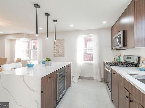Welcome to 915 East Mt. Airy Avenue! A charming and cozy oasis, I could not imagine anyone not being excited to retreat to a beautiful home like this. 915 East Mt. Airy is a place where you can peacefully unwind and enjoy life. Upon entering, you will be impressed with a bright and cheery open floor concept, streamlined from living room, to dining room, to kitchen. There are beautifully refinished and colored hardwood floors throughout, exquisite light fixtures, and fresh paint throughout. Amongst other wonderful amenities in the home, the kitchen is the statement piece showcasing modern cabinetry, marble countertops, a beautiful island design, and stainless-steel appliances including a wine cooler for entertaining. Your guests will be impressed, and you will be inspired to prepare delicious meals. Off the kitchen is the basement door which leads to a fully finished basement with storage space and a beautiful half bath for your convenience. Design it your way--home office, entertainment space or home gym?a variety of options. There is also a nice, clean garage with automated garage door that is perfect to preserve your vehicle. Plus, there is a laundry area with washer, dryer combo included. This home is gorgeous with such tasteful elements and design. There is lots of outdoor space perfect for barbecues and ample green space for those with a green thumb. While it is off a busy street, it is surprisingly quiet and blocks out noise well. The location speaks for itself?minutes from center city, and very convenient to local stores and shops. Furthermore, it is in the heart of Mt. Airy. !!!!Do not miss out! You must see it for yourself! Make this gem your forever home. Upstairs are 3 sizeable bedrooms and 1 full and 1 half bath. The large master bedroom has plenty of closet space and an added beautiful half bathroom. Enjoy a spa-like experience in the full bathroom which boasts an elegant design, a jetted tub and a luxurious rainfall showerhead install.