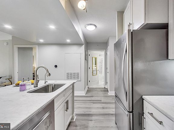 Centrally situated in downtown DC, this 2BR/2BA residence at the Artisan is a masterpiece of meticulous renovations. Elevating its allure, this exceptional 11th floor unit boasts an open modern kitchen, complete with stainless steel appliances, stylish under mount kitchen sink, gas range, custom Magnolia cabinets, Bianco Carrera countertops, a glass white blend mosaic backsplash, and under cabinet lighting. It also includes a beautiful wine rack. Designed for both comfort and entertainment, the living area offers ample space and opens up to a private balcony with delightful South-facing light and views. The owner's suite is thoughtfully designed with ample space, including a practical home office nook, a luxurious custom walk-in closet, and a spa-inspired en-suite bathroom. The bathroom is adorned with elegant designer fixtures, and it boasts a frameless LED Light Anti-Fog wall mirror. The flooring showcases an impressive combination of Mondrian marble and travertine mosaic, while the walls are adorned with exquisite Ashford Carrera marble. Completing the picture is a beautifully designed walk-in shower, adding a touch of opulence to the overall ambiance. The guest bedroom is generously proportioned and includes a walk-in closet equipped with custom built-ins. Additionally, the home presents a fully renovated second full bathroom with Ashford Carrera marble, a Jetted Bath Tub, a full-size stacked LG washer & dryer, and an abundance of storage space. Throughout the unit, you'll find new recessed lighting, elegant new LVT flooring, lending a sophisticated ambiance to every room. Prepare to be amazed by this high end renovation. Also, extra storage is included. Residents of the Artisan revel in the convenience of a concierge/doorman, a well-appointed fitness center, a wonderful party room, and a roof deck with spectacular views and equipped with BBQ grills. Moreover, this pet-friendly building welcomes all furry companions, making it the ideal place to call home. The condominium fees cover gas, water, trash disposal, building maintenance, insurance, management, and reserve funds. Moreover, residents have the option to rent parking spaces located next to the building for a monthly fee of $300. Square Feet approx. as per RealVision measurements.