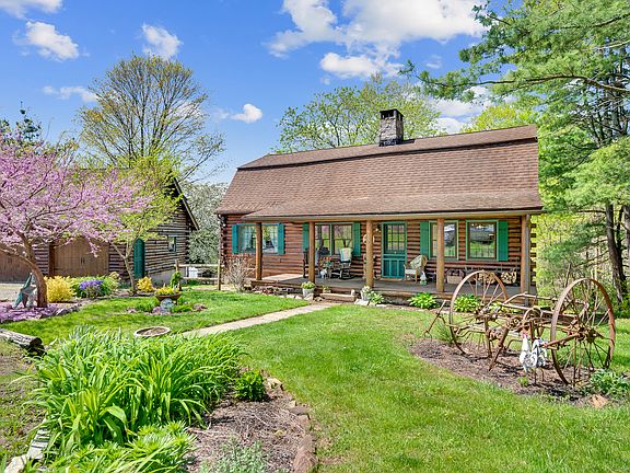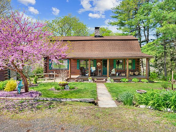 SELLERS EAGER AND ENTERTAINING Want the comfort and feel of Northern New England, then this is your next home This log cabin has a circular driveway, central air-conditioning, 3-bay detached garage with a large walk-up loft with plenty of storage space. Have your morning coffee, read, take a nap or listen to nature on the nice-sized covered porch in the front of the house. The main level has all the feel of comfortable living with a newly-carpeted living room with exposed beams, three large windows, custom stone-crafted fireplace with wood-burning insert, spacious u-shaped tile kitchen, separate pantry room that leads out to the back deck. Dining room has hardwood floors wrapping around the fireplace in the living room. Main-level bedroom, is currently being used as office/craft room, and a half-bath. Second level has a large primary bedroom, with primary bath and double closets as well as two more bedrooms and a full bath which makes this complete. The partially-finished full basement has another custom stone-crafted fireplace with wood pellet stove insert. The unfinished portion of the basement is a separate room which consists of shelving, oil tank, hot water heater, boiler and a washer and dryer. It has a walk-out exit and also double doors that open to your very own wooded backyard. Central air was install around 2021, hot water heater (2022 and oil tank was serviced in January 2024. Newer windows throughout the home, except the basement.