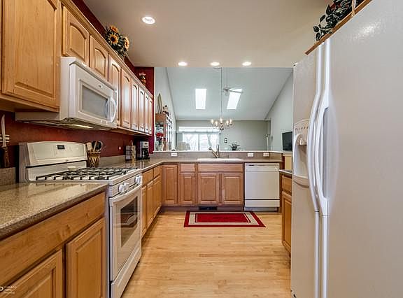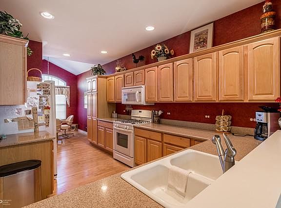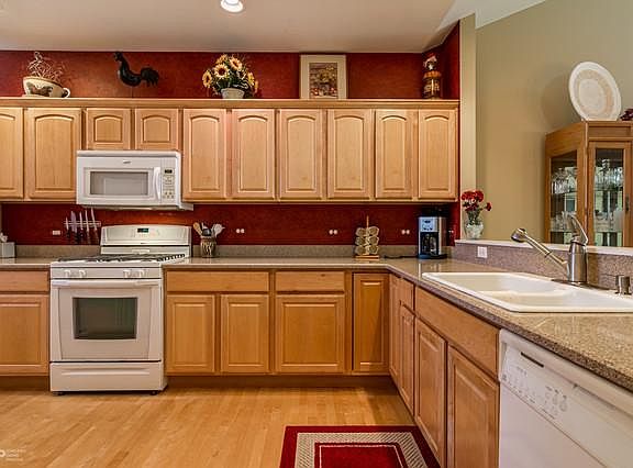 FOR THE SAFETY OF ALL, there are gloves inside the home. Please use and throw away in the provided basket as you leave. Please only use/take one pair per person. Don't miss this one! Beautiful ranch duplex is move in ready and barely lived in! You'll love the open, airy floor plan made brighter with skylights and a vaulted ceiling! The kitchen opens to the living/dining room and has loads of maple cabinets, 2 pantries and plenty of solid surface counters! There's a handy eating area with a vaulted ceiling for you, too! Wander out the slider to your patio from where you can enjoy the nice yard and trees. There's even a landscape block planter box surrounding the patio for your green thumb. The primary bedroom has a tray ceiling and private bath that has 2 sinks and a big shower with a built in seat and safety bar. The walk in closet is big enough for all your things! 2nd bedroom and BR3 (prresently den) are great. MAPLE flooring highlights most of the first floor, with ceramic tile in the baths and laundry. The huge unfinished basement is waiting for your finishing, playing or just your things! There's even a plumbing rough in for a bath. ROOF is only 3 years old! Built in surround sound in great room, electrostatic filter on furnace. Central vac, too! This home is walking distance to the park, library and Algonquin Commons with shopping, restaurants and fun! 55+ community, you'll love it! This is the largest model in the subdivision, you'll be so happy here! (Ice maker dispenser works intermittently, as is) TVs in master bedroom and kitchen stay.