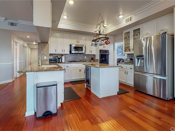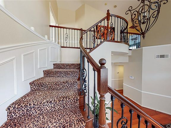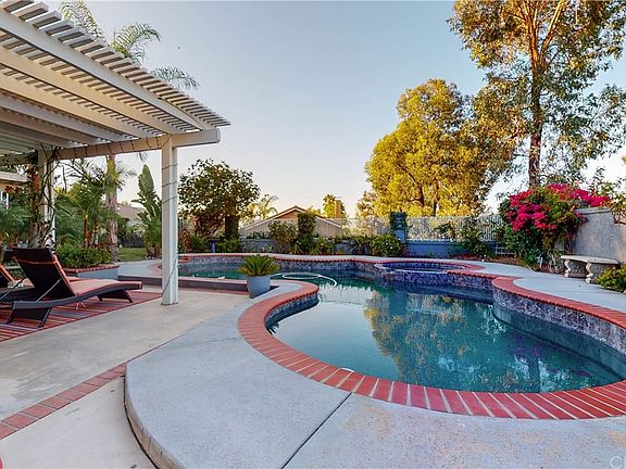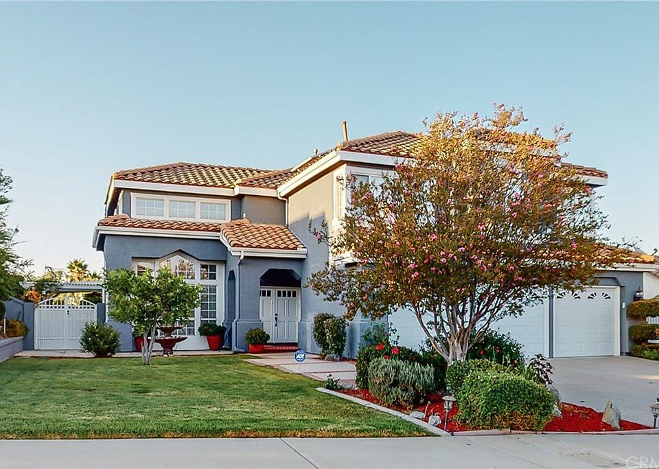 Mission Grove property near Canyon Crest area. Great cul-de-sac location. Upgrades include decorative wrought iron banisters, wood flooring, travertine flooring, plantation shutters, and wood blinds throughout. One of the best features of this home is the backyard! Besides the Pebbletec pool and spa, there is a large covered outdoor kitchen/living room/bar area with polished cement counters, TV hook-ups, and ceiling fans. Beautifully landscaped. Removable Child Safety fence surrounds pool. Potential for RV parking. The kitchen features white cabinets, granite counters, a center island, and a breakfast bar. Built-in bookshelves and fireplace in the Family room. High ceilings. The spacious master suite features a balcony that's great for enjoying the amazing sunrise view of the mountains or evening city lights. The master bath has been updated with a roman tub, bronze finish fixtures, and a gorgeous travertine shower and soaking tub. Solar panels, so the new buyer will really benefit from low-cost utility bills.