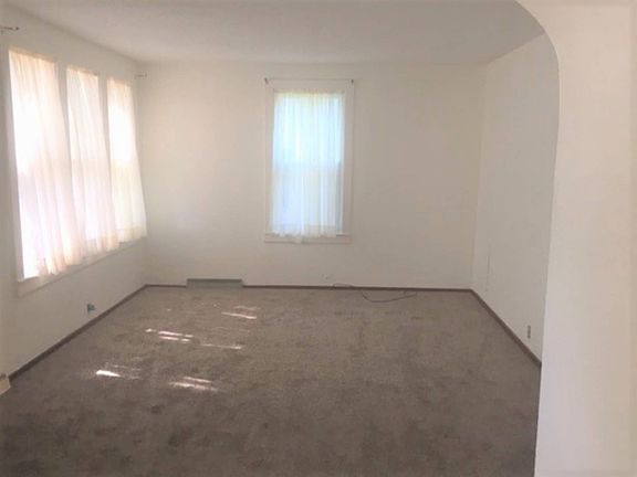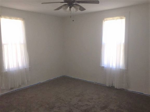 Well maintained home with full basement. Entrance by the covered front porch featuring grey vinyl siding and a newer roof. LR: brand new taupe carpet, freshly painted walls. Arched entrance to kitchen. Kitchen: large kitchen has Merrilatt cabinets, painted cream counter top. White refrigerator, white smooth top range, white microwave above range. Taupe block vinyl tile. Thermopane windows. Built in glass front cabinets. Lots of room in this kitchen to entertain. BR: large bedroom has new taupe carpet, freshly painted white walls, closet, new thermopanes BR: second bedroom, has new taupe carpet, fresh white walls, closet, thermopane windows. Bath: tan fixtures, vanity and commode, taupe vinyl floor Whole house attic fan in wide hallway. Entrance to basement has carpeted floor and white walls. Basement: this dry basement has a newer gas furnace. Also has central air. It's open to one room so you can divide as you prefer. Back yard : privacy fence around the large shady back yard One car garage and drive has off street parking code 240 RE tax $902.74 07042017