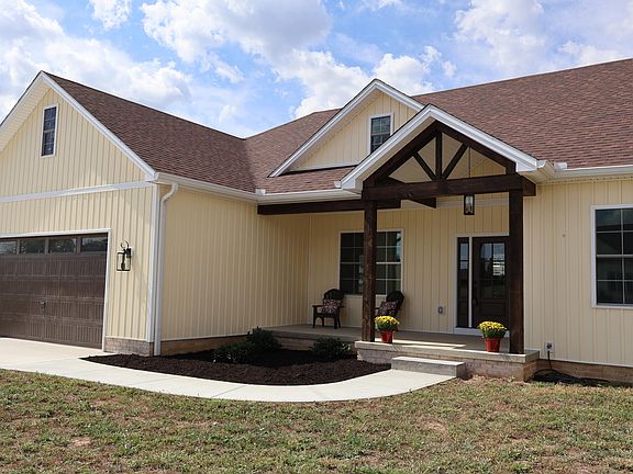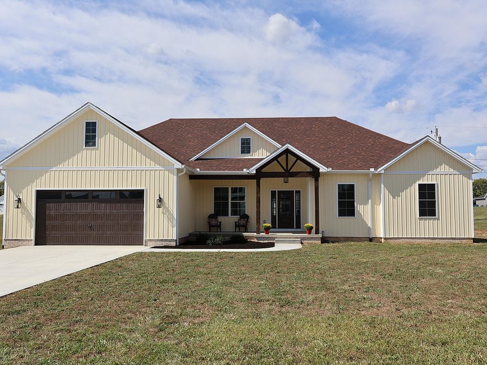 Step into luxury living with this stunning one-story new construction home nestled in the Rolling Hills subdivision. Conveniently located just minutes from downtown Harrodsburg, and a short drive to Wilmore, Nicholasville, and Lexington, this residence offers the perfect blend of tranquility and accessibility. As you enter, be greeted by the elegance of luxury vinyl flooring that flows seamlessly throughout the home. The great room boasts built-in shelving and an inviting electric fireplace, creating a cozy atmosphere for gatherings with friends and family. Prepare to be wowed by the spacious kitchen featuring a large island with ample seating, perfect for entertaining guests or enjoying meals. With pristine white cabinetry, a stylish tile backsplash, and stainless steel appliances, the kitchen is both functional and beautiful. Step outside to the large, covered patio. Retreat to the expansive primary suite, complete with a luxurious soaking tub, separate shower, and toilet area. Large closets with adjustable shelving, ensure ample space for all your wardrobe and storage needs.