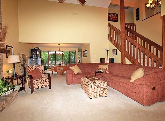 Stunning! Open Floor Plan. Soaring Ceilings. Two Story Family Room with Floor to Ceiling Brick Fireplace Open to Dining Room with wall of windows and Kitchen with beautiful Granite Tops, Island Seating, Updated appliances, Large Pantry and access to Spacious Deck overlooking Gorgeous and Serene Yard Full of Mature Trees. Two Master Suites! One on First Floor and One on Second. Attached garage and first floor laundry make this home easy living. Updated baths with new ceramic shower. Second floor boasts two bedrooms, full bath and loft that makes a great office. Finished basement with abundant windows, wet bar, fourth bedroom with private bath and walk in shower, access to lower deck. Don't miss this one!