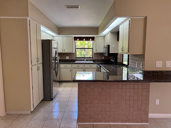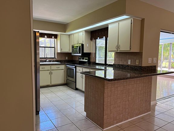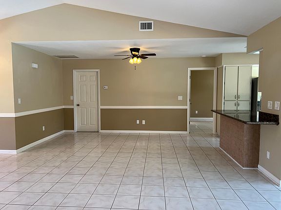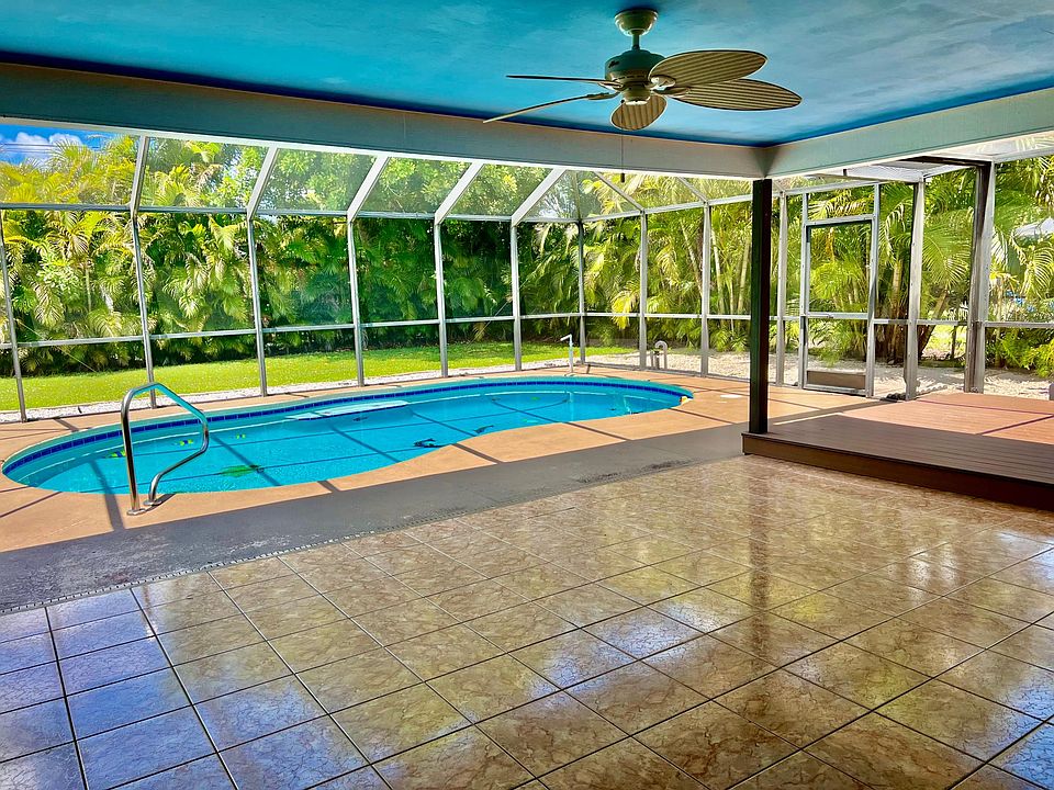 UNFURNISHED ANNUAL RENTAL. LARGE Covered Lanai - GREAT OUTDOOR LIVING SPACE POOL with seating ledge, DECK AND RAISED PATIO. Pet friendly with large yard and FENCE . NO CARPET - all flooring is TILE. VAULTED Great Room / Dining Room opens to Pool and Lanai with triple patio doors. Master Suite with walk-in closet & double vanity, linen closet and walk-in tile shower. Pool Bath door opens to pool & lanai. Large sunny & spacious Kitchen with lots of cabinetry & Pantry, stainless appliance package, breakfast bar and granite counters. Covered front screen porch entrance. Spacious 2 car garage. Updated landscaping and irrigation system. Newly painted w/neutral colors that will enhance any furniture theme. Great central Cape location just east of Country Club / south of Veterans / north of Cape Coral Parkway. PET friendly. Cats ok. Dogs ok - but no aggressive breeds. Pet fee required. Pool Service, Lawn Service, Trash and Pest Control is included. First, Last and Security Deposit Required. No previous evictions or felonies. Reputable local landlord.