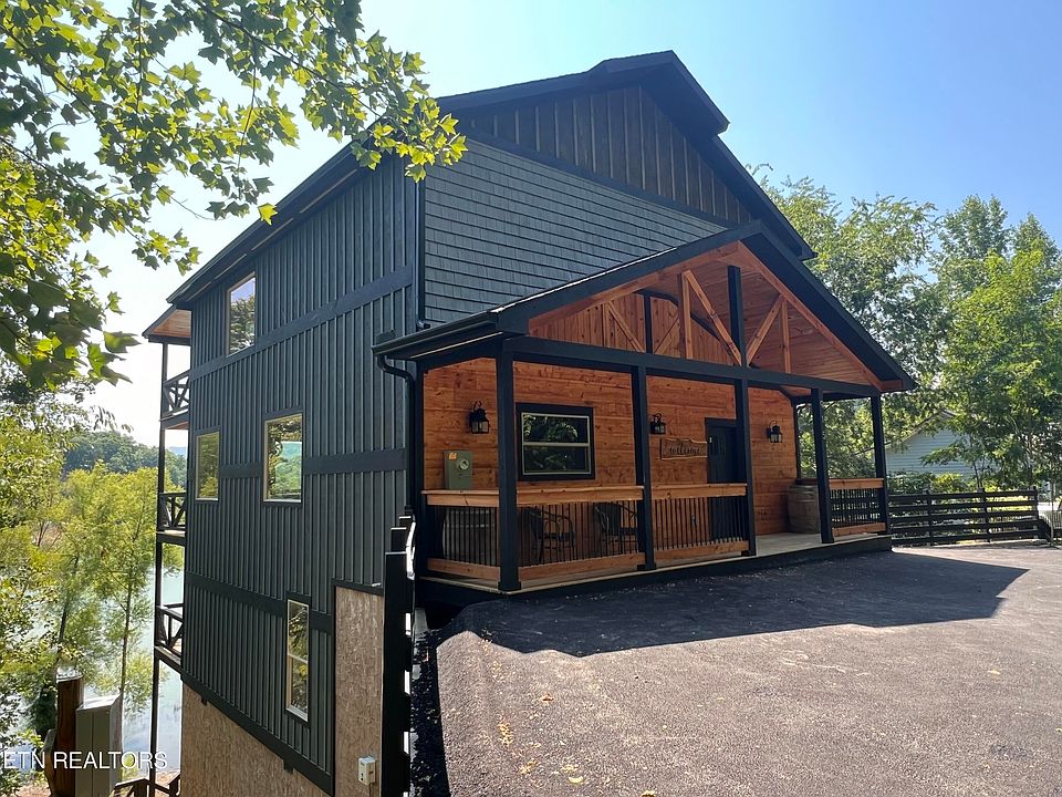 Discover luxury lakefront living at its finest in this modern contemporary cabin located in the prestigious gated community of Timberlake Bay. Offering breathtaking views of Douglas Lake and the surrounding mountains, this brand new cabin features four decks, including a small deck right at the water's edge, perfect for enjoying the serene lakefront setting. Ideal for outdoor enthusiasts, the property is kayak-ready with direct access to the lake. Inside this fully furnished cabin, the main floor boasts a well-appointed kitchen, spacious living room, and dining area all overlooking the lake, complemented by a convenient half bath. Upstairs, two main bedrooms each with their own bathrooms provide comfort and privacy, with the spacious master bedroom offering direct access to a deck and a luxurious jetted tub with panoramic lake views, with high ceilings for added luxury. The lower level is an entertainment haven with a game room, theater room, additional bedroom, full bathroom, and laundry facilities. This level also features a deck with stunning lake views and easy access down to the waterfront. Residents of Timberlake Bay enjoy exclusive access to community amenities including a pool, clubhouse, and storage area for recreational vehicles, all within walking distance from the cabin. Known for its successful overnight rental opportunities, this property presents both a lucrative investment and a serene retreat just 15 miles from Pigeon Forge and 20 miles from Gatlinburg and the Smoky Mountains. Don't miss your chance to own this exceptional lakefront property. Schedule your showing today!