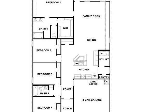 The Kingston is a single-story, 4-bedroom, 2-bathroom home featuring approximately 2,032 square feet of living space. The entry opens to the secondary bedrooms, and bath with linen closet. Center kitchen includes a large breakfast bar and perfect sized pantry. Open concept floor plan boasts spacious combined family room and dining area. The main bedroom, bedroom 1, features a sloped ceiling and attractive bathroom with dual vanities and walk-in closet. The standard covered patio is located off the family room. Additional finishes include granite countertops and stainless-steel appliances. You’ll enjoy added security in your new D.R. Horton home with our Home is Connected features. Using one central hub that talks to all the devices in your home, you can control the lights, thermostat and locks, all from your cellular device. With D.R. Horton's simple buying process and ten-year limited warranty, there's no reason to wait! (Prices, plans, dimensions, specifications, features, incentives, and availability are subject to change without notice obligation)