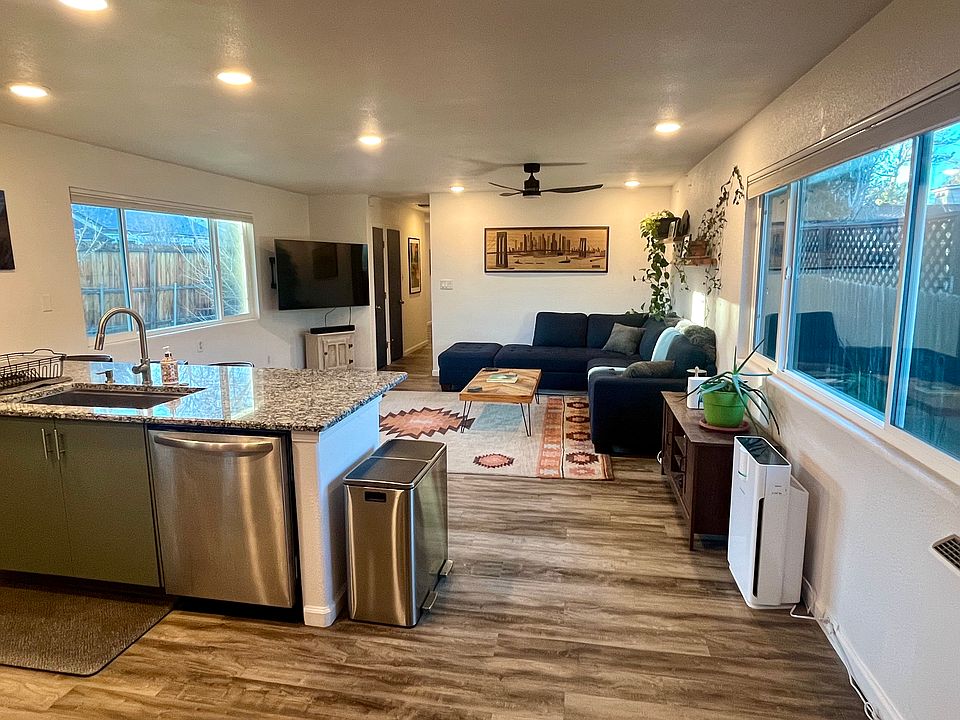 Unit includes a large, open kitchen which looks onto a living room with big windows. A newly remolded hall bathroom includes custom shower & heated tile floor. The master bedroom has a large closet with 2 sizeable dressers and a private bathroom. This private bathroom is newly remolded with a tub & heated tile floor. The office includes a standing desk, monitor, and pull out sleeper couch. The backyard is large and secluded with a patio including yellow rose bushes, large outdoor table, workout station, and trampoline. There is an entry room at the front of the house which is shared with a front studio. Both units have their own keyed entry.