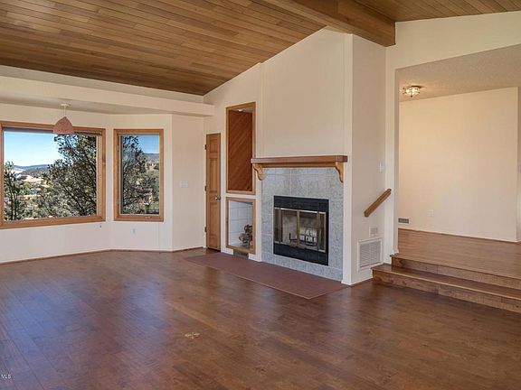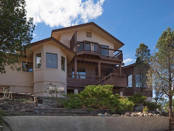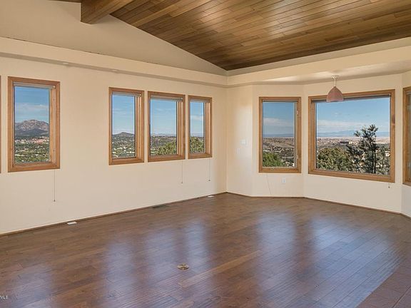 Views, views and more views from this home sitting high on a hill in Prescott and just minutes from downtown. Brand new Wood floors throughout main level, new carpet in all 4 bedrooms and new tile in all 3 bathrooms. Kitchen needs updating but has an easy layout and nice space. Enter on the main level where you will find 2 bedrooms plus a full bath and deck access. Great room has gorgeous tongue and groove ceiling, wood burning fireplace and wood windows. Upper level has 2 master suites with an AZ room connecting them. Also find an artist studio or office with a private balcony, sink area and wood burning stove. 2 car garage plus Large workshop on main. Seller is motivated!!