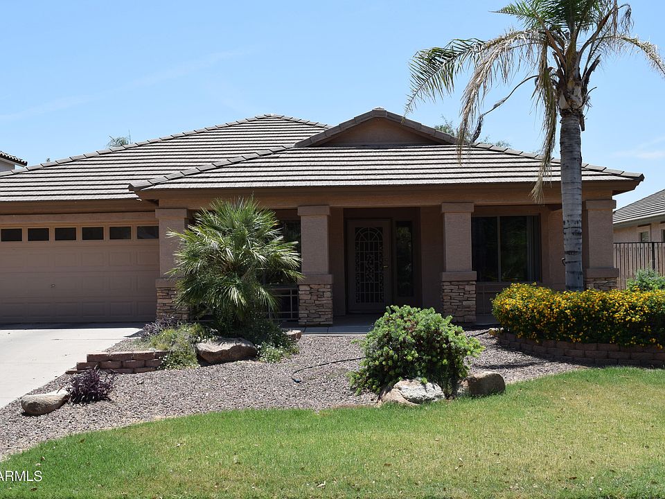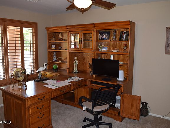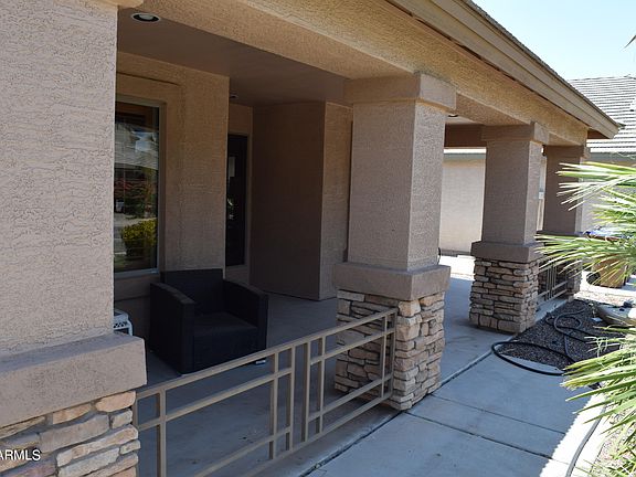 Honey, stop the car! The spacious layout of this single-story home with three bedrooms and a library offers plenty of room for both relaxation and productivity. There is a large, comfortable front porch for sitting and enjoying Arizona evenings. The chef-friendly kitchen has custom tile work, an island, a gas stove, a large walk-in pantry and plenty of room for entertaining. The resort-style backyard features half a dozen large palm trees, an oversized pool, built-in gas barbecue, and covered patio which is perfect for entertaining or simply enjoying some relaxation outdoors. The oversized pool has a Baja step, water feature and in-pool table and bench which is setup for an umbrella. Plus, the extra touches like ceiling fans, shutters, and cabinets throughout the home add both comfort and convenience. And don't forget about the garage - those built-in cabinets, RV gate, side-door to the back yard and a sink make it a handy space for storage and projects. Did I mention there is no one directly behind you? This home has everything one could ask for!