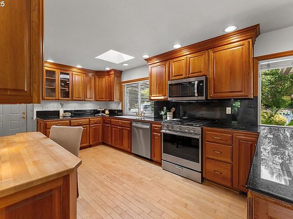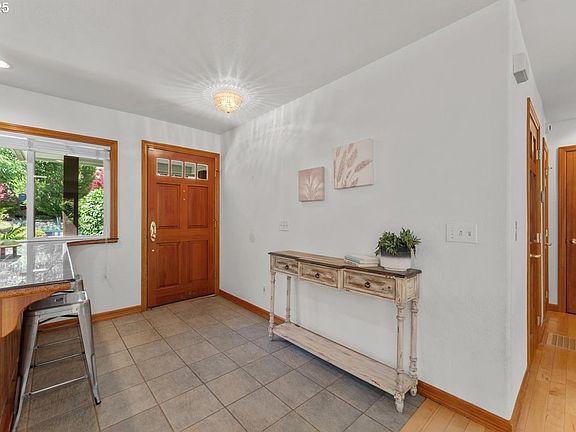 This charming daylight ranch in a picturesque SW Portland neighborhood has fabulous curb appeal! Just try not to smile at the adorable yet strong & functional white picket fence w/gates surrounding the front yard landscape adorned w/beautiful shrubbery & flowering trees. You’ll feel your heart rate slowing & your breath deepening as you stroll the almost half acre grounds on meandering flagstone pathways & explore delightful corners of this peaceful & private retreat. The kitchen has gleaming stainless steel appliances, a skylight, hardwood floors, granite tile countertops & beautiful cabinetry. The open living & dining rooms make an impressive statement w/expansive windows that let the outside in + a cozy fireplace for cooler evenings. Step out onto the 590 sq. ft. deck & view your own private backyard oasis, reminiscent of a delightful English garden w/winding pathways, greenery arches, & diverse plantings. The primary bedroom w/sliding door leads out onto the expansive deck, + a walk-in closet w/shelving so that everything has its place + a connected bathroom w/bidet toilet & tub/shower combo. The lower level, partially remodeled in 2025, includes 2 bedrooms, family room, exercise room, laundry & a remodeled bathroom. The large laundry area w/storage cabinets & a utility sink can be a handy kitchenette if you choose to use this lower space as an ADU. Ideal for multi-generational living, rent it out or Airbnb? A practical gravel drive on one side of the house leads through a double gate to the back yard and studio. So much opportunity here! Clear out some of the volunteer trees and create a fire pit, raised garden beds, bocce ball area and so much more! Smart updates in 2015 include new roof, furnace, AC, hot water heater, deck & sprinkler system! On nearly ½ acre, there is abundant space for dreaming & creating. Near PDX, St Vincent’s Medical Center, Forest Park, restaurants & shopping, this oasis in the middle of suburbia is a rare find!