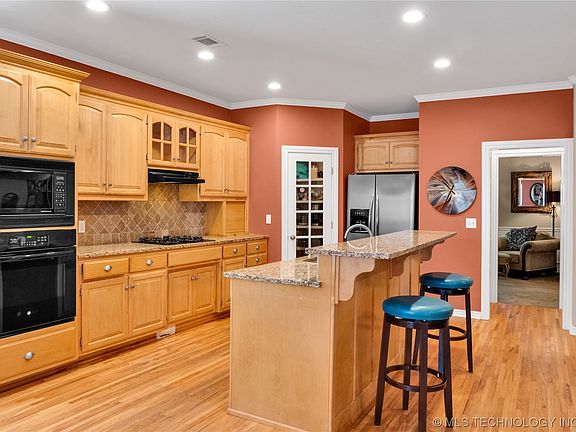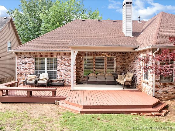 Don't miss out on this gorgeous single story 3 bedroom 2 bath brick home located in beautiful Stone Creek Park on a cul-de-sac. Conveniently located near amenities, shopping, restaurants, recreation, and easy access to Hwys 169 & 64; Creek turnpike & BA expressway. Great open concept layout with split floor plan, high ceilings, and tons of storage. Kitchen features granite counter tops, walk-in pantry, and large center island for visiting while you cook. Spacious master bed with huge walk-in closet that attaches to additional cedar lined closet. You'll love the large master bath with whirlpool tub, separate shower & double vanities! Both bedrooms are spacious with large closets and a full bath across the hall. Enjoy a cup of coffee on your front porch, admiring the beautiful landscaping and mature trees, or relaxing under the covered back patio/deck. Generously sized office & formal dining/ flex room, oversized 2 car garage, and central vac!