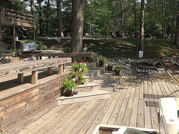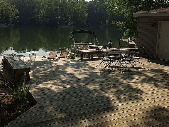 This is a lake front property located on beautiful Rocky Fork lake which is a private lake located south of Cecil Harden lake. It is a 100 acre lake with 110 homes. The main floor features a kitchen, 2 bedrooms, a full bath and a living room with a wood burning fireplace. Walk out to a screened in porch and a 40’ deck overlooking the lake. The lower floor has a laundry room, full bath, bedroom with a bed and 4 built in bunk beds. Also a family room with a bar. Walk out of the basement to a covered patio and a huge deck and dock with room for a large pontoon boat. There is an 8’ x 16’ building to store all your lake toys. There is a small beach and also an outside shower. There is a nice fire pit.