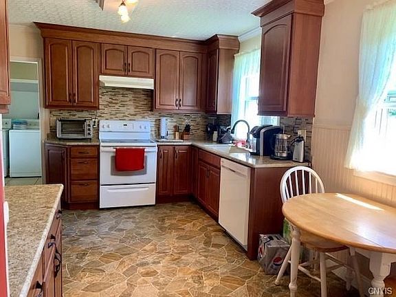 Two out buildings, new kitchen, newer roof, new floors in main rooms, steps to dock on water in rear of yard.
