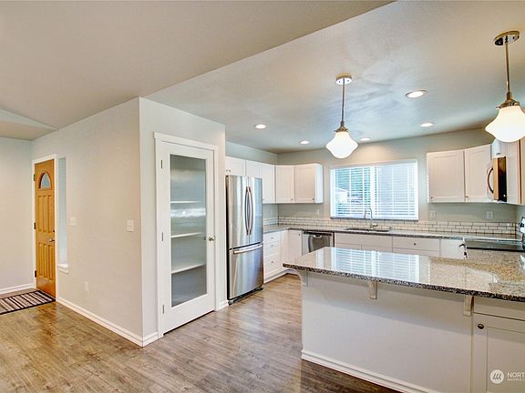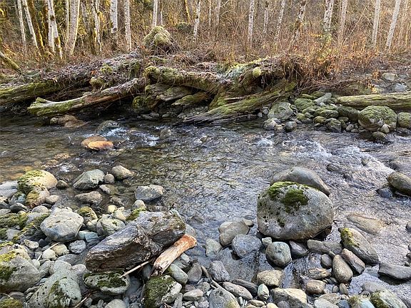Perfect Rambler in Pressentin Creek. This like-new home has 1390SF, 3BR, 1.75BA and is loaded with sought-after features. The open vaulted great room, bright and gleaming kitchen w eating bar, primary with walk-in closet and double vanity, and a great covered deck for your outdoor living enjoyment. Rich, hard-surface flooring throughout, granite kitchen counters, tile counters in baths, tile backsplash and more. All set in a small community along the gurgling Pressentin Creek just about 1/2 hour from the I-5 corridor in the Skagit Valley. Really a turn-key home includes all appliances, mini-split heat and A/C, detached garage with nice shop space and a fenced yard area in the back of the home. Room for R/V or boat.