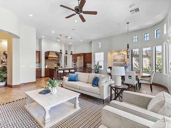 Outdoor spaces include an extended patio with a water feature and exterior fireplace, creating a comfortable setting for gatherings or quiet evenings. Set in the heart of North Scottsdale, the home is just minutes from dining, shopping, and DC Ranch community amenities. The community features 50 miles of scenic walking paths, 47 neighborhood pocket parks, and the 15,000 sq. ft. Desert Camp Community Center, within a 5-minute walk, offering a fitness facility, lap and splash pools, tennis and pickleball courts, basketball, playgrounds, and multiple gathering areas. DC Ranch borders the McDowell Sonoran Preserve and is just five minutes north of the 101 Freeway in North Scottsdale. Market Street's shops and restaurants are within a mile's walk.