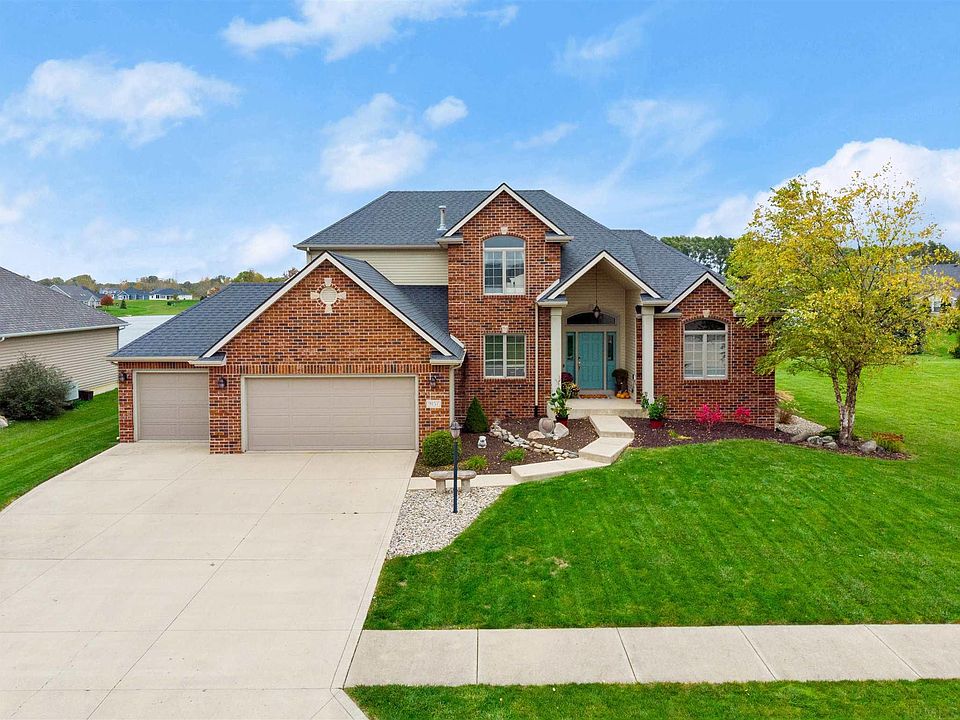 **Back on the Market ~ as Buyer financing fell through**Welcome! This former Delagrange Model Home, is situated on a beautiful pond lot! The 1 1/2-story brick front home with quoin corners has over 2000 sqft of living space. The unfinished, daylight basement is pre-plumbed and the full footprint of the house. This would give you an additional 1380 sqft of potential living space. As you make your way in to the entry, you will immediately see the pond view! This view can be seen from the great room, kitchen, & breakfast nook! The expansive 2-story great room has a corner fireplace and ceiling to floor windows that bring in wonderful natural light. The kitchen has a good amount of cabinet and counter space along with a separate pantry. All appliances stay with the home. An updated half bath is also located on the main floor. The beautiful primary bedroom ensuite, has cathedral ceiling that makes the room feel even bigger. The bathroom has a jetted whirlpool tub, twin sink vanities, separate shower and a spacious walk-in closet. Making your way up the side load stairway to upper level, you'll find a large loft area plus the 2 secondary Bedrooms that share the full bath. The loft area makes for a great entertainment area or office space. Enjoy evenings on your deck or the stamped concrete, free-form patio with family and friends. The oversized 3 car garage also gives you more space for storage. Close to Whispering Creek Golf Club and Kreager Park.