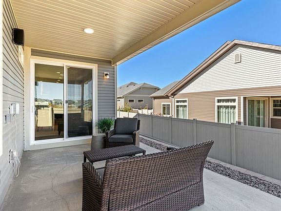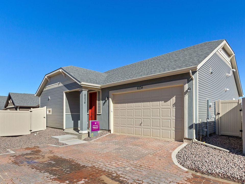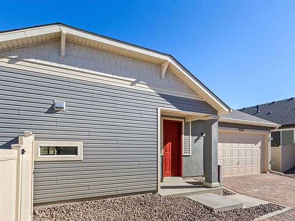 This ranch plan features 1409 square feet of open concept living and is located in The Retreat, a private 55+ community in Banning Lewis Ranch.. Upon entering, you are greeted with a spacious great room, dining area, and kitchen that all flow seamlessly together. The kitchen boasts a large eat-in island that is perfect for quiet nights in or large gatherings, ample cabinetry and storage for all your cooking needs, and numerous large windows to allow in an abundance of light. The primary suite houses an adjoining bathroom complete with a double vanity, walk-in closet, and water closet. A secondary bedroom and bathroom are located off the garage entry for guest or family convenience. These homes are built in cul-de-sacs of 4 and have a shared driveway.