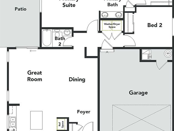 This ranch plan features 1409 square feet of open concept living and is located in The Retreat, a private 55+ community in Banning Lewis Ranch.. Upon entering, you are greeted with a spacious great room, dining area, and kitchen that all flow seamlessly together. The kitchen boasts a large eat-in island that is perfect for quiet nights in or large gatherings, ample cabinetry and storage for all your cooking needs, and numerous large windows to allow in an abundance of light. The primary suite houses an adjoining bathroom complete with a double vanity, walk-in closet, and water closet. A secondary bedroom and bathroom are located off the garage entry for guest or family convenience. These homes are built in cul-de-sacs of 4 and have a shared driveway.