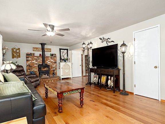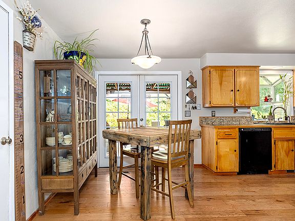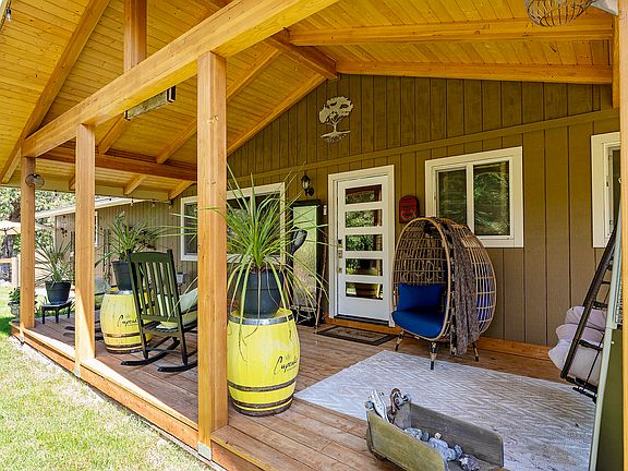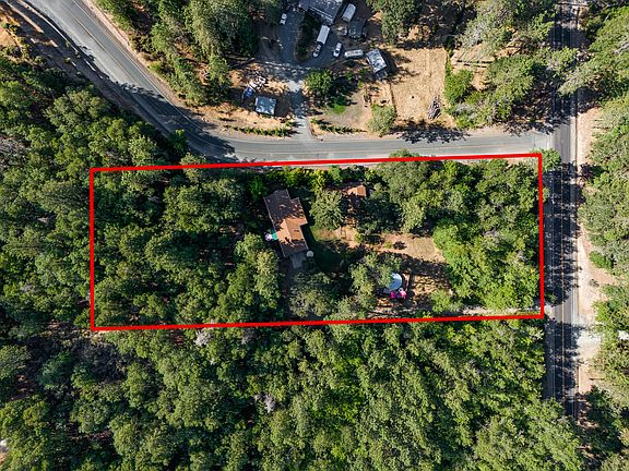 Nestled in the heart of nature, this home offers the perfect blend of rustic charm and modern touches. The sprawling front porch, framed by exposed wooden beams, invites you to relax and take in the serene forest views. The family room has a large picture window the brings the woodland landscape right into your living space. Engineered wood floors run throughout, adding warmth and elegance. The kitchen features granite countertops and a stylish tiled backsplash. The primary bedroom has its own bath and a ceiling fan for added comfort. The home has all-new vinyl windows, roof, gutters, and fencing. Outside, the 2.5-acre property is a private oasis, beautifully landscaped with fruit trees, a seasonal pond, and a refreshing swimming pool with a sunbathing deck. Need extra space, the additional workshop is equipped with wall AC and heating, making it perfect for year-round use. Come experience the perfect harmony of nature and comfort in this exceptional forest retreat.